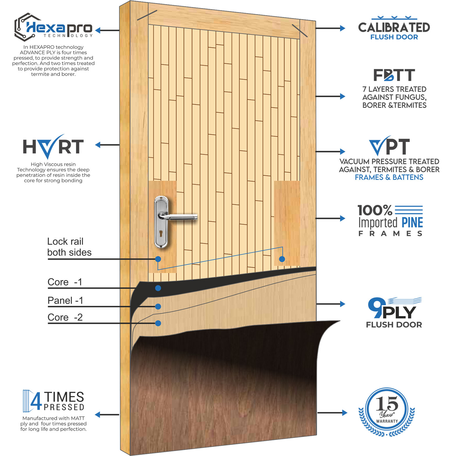 100% IMPORTED PINE FRAMES, FUNGUS BORER TERMITE TREATED, 100% CALIBRATED FLUSH DOOR