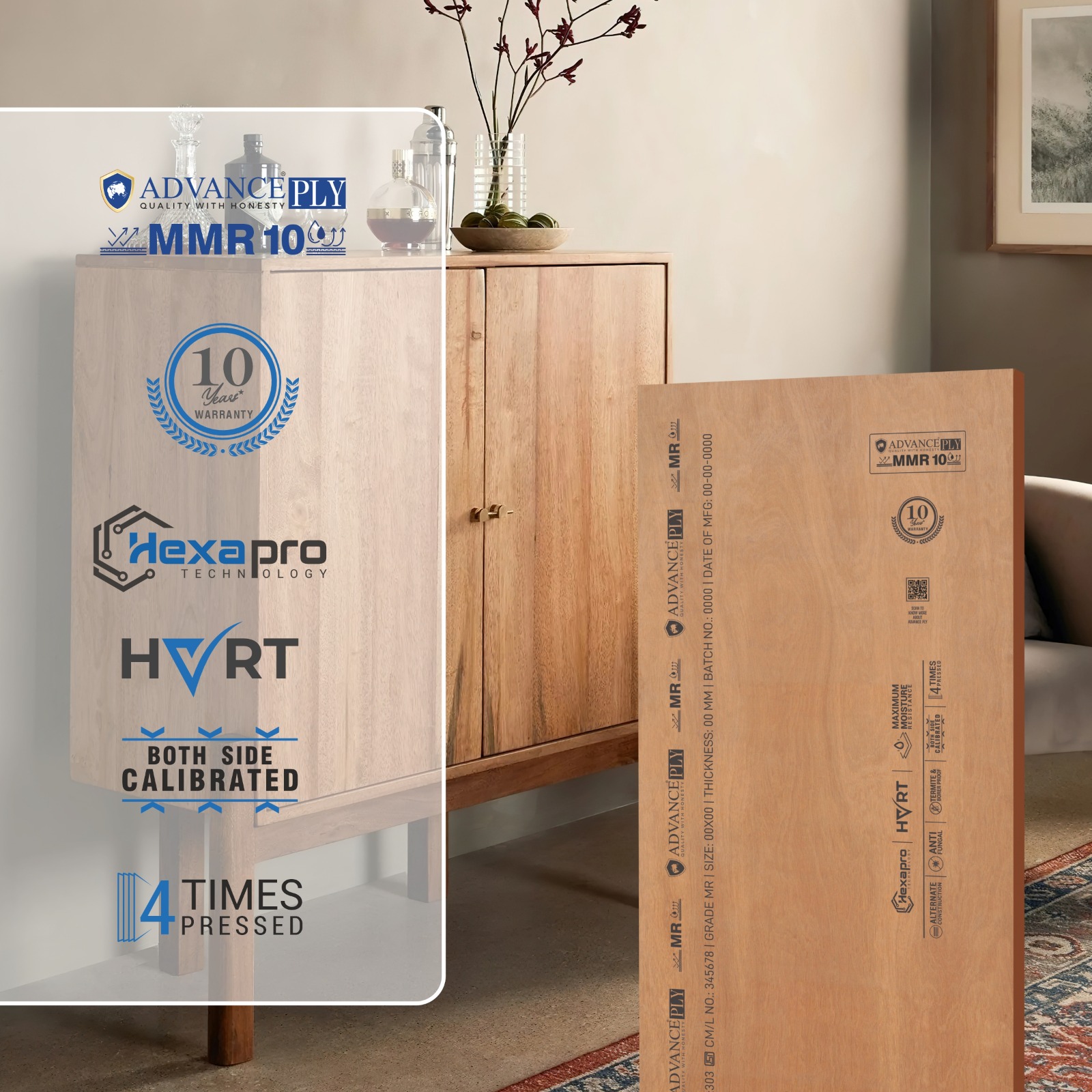 AdvancePly MMR10 is crafted to meet the demands of interior applications with enhanced moisture resistance and durability. Built using HexaPro Technology, it offers a seamless combination of strength and aesthetics. The Okoume face and precision calibration ensure a flawless finish, making it an excellent choice for creating beautiful and long-lasting interior spaces. Backed by advanced treatments, it stands as a reliable solution for diverse interior needs.