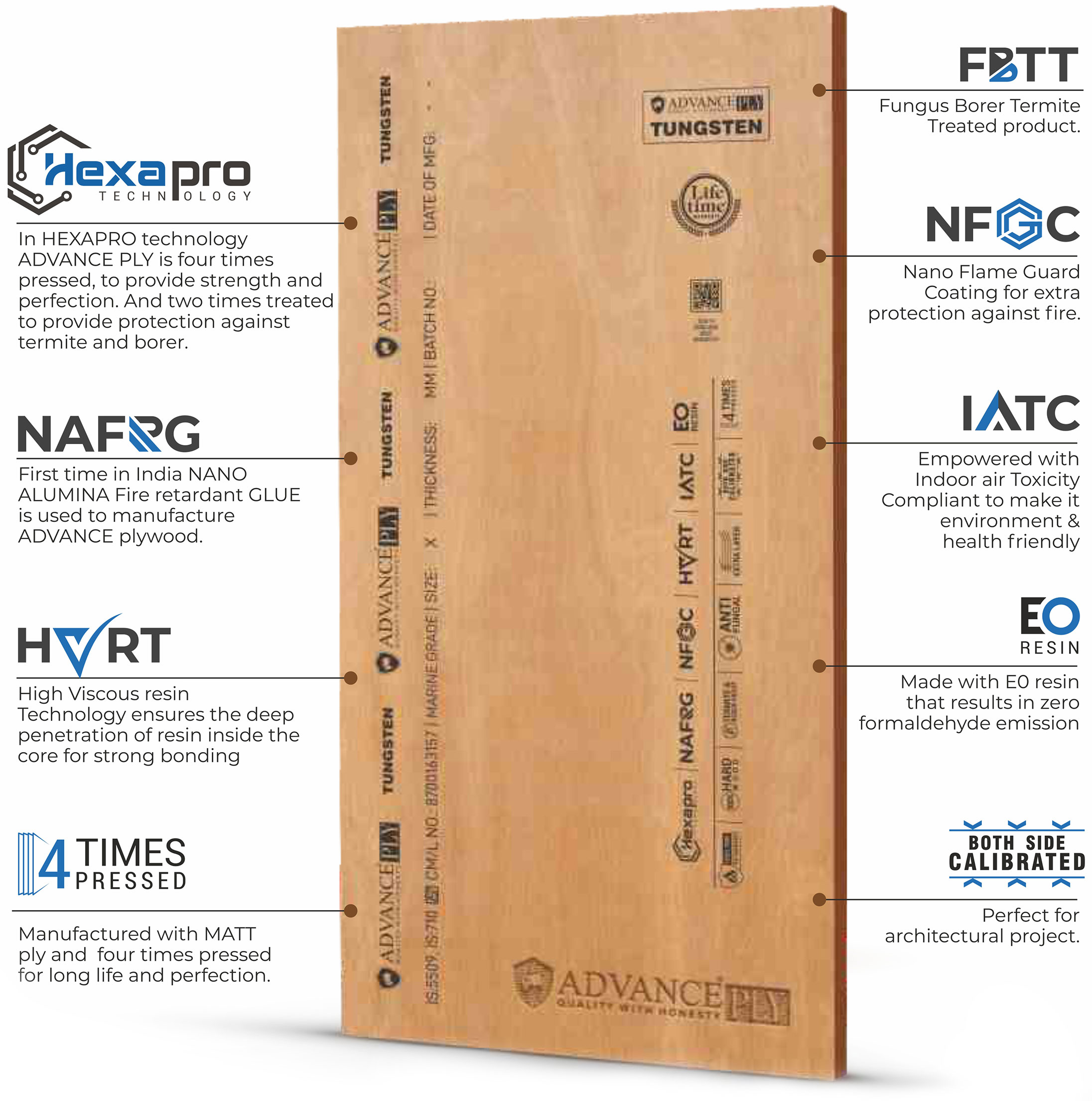 MADE WITH EO GRADE RESIN, SUPER HIGH DENSITY, BOILING WATER PROOF, MARINE GRADE, FIRE RETARDANT, IS: 5509, IS: 710, 100% HARDWOOD CONSTRUCTION