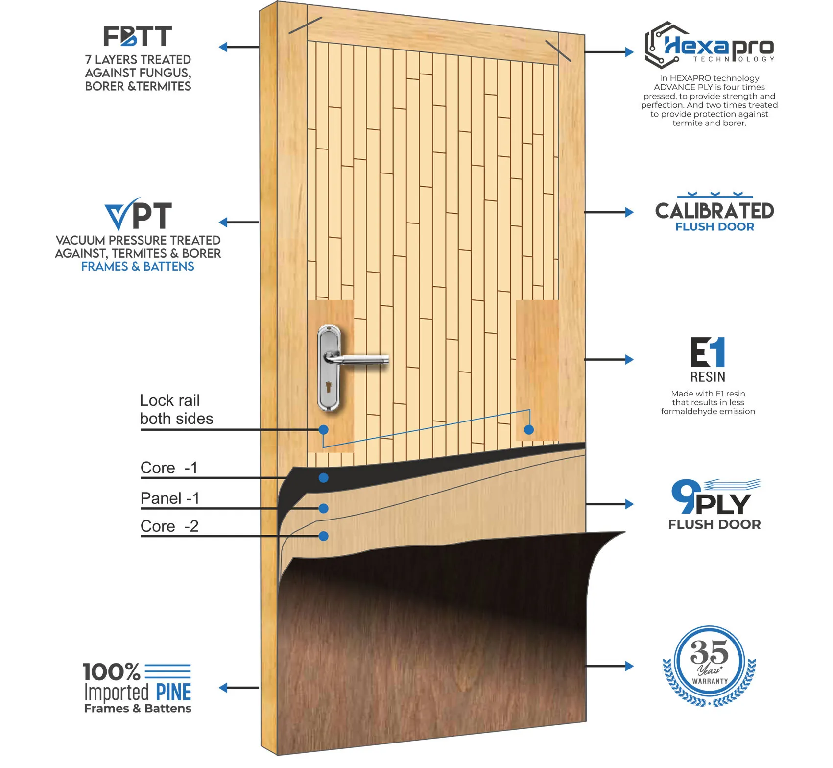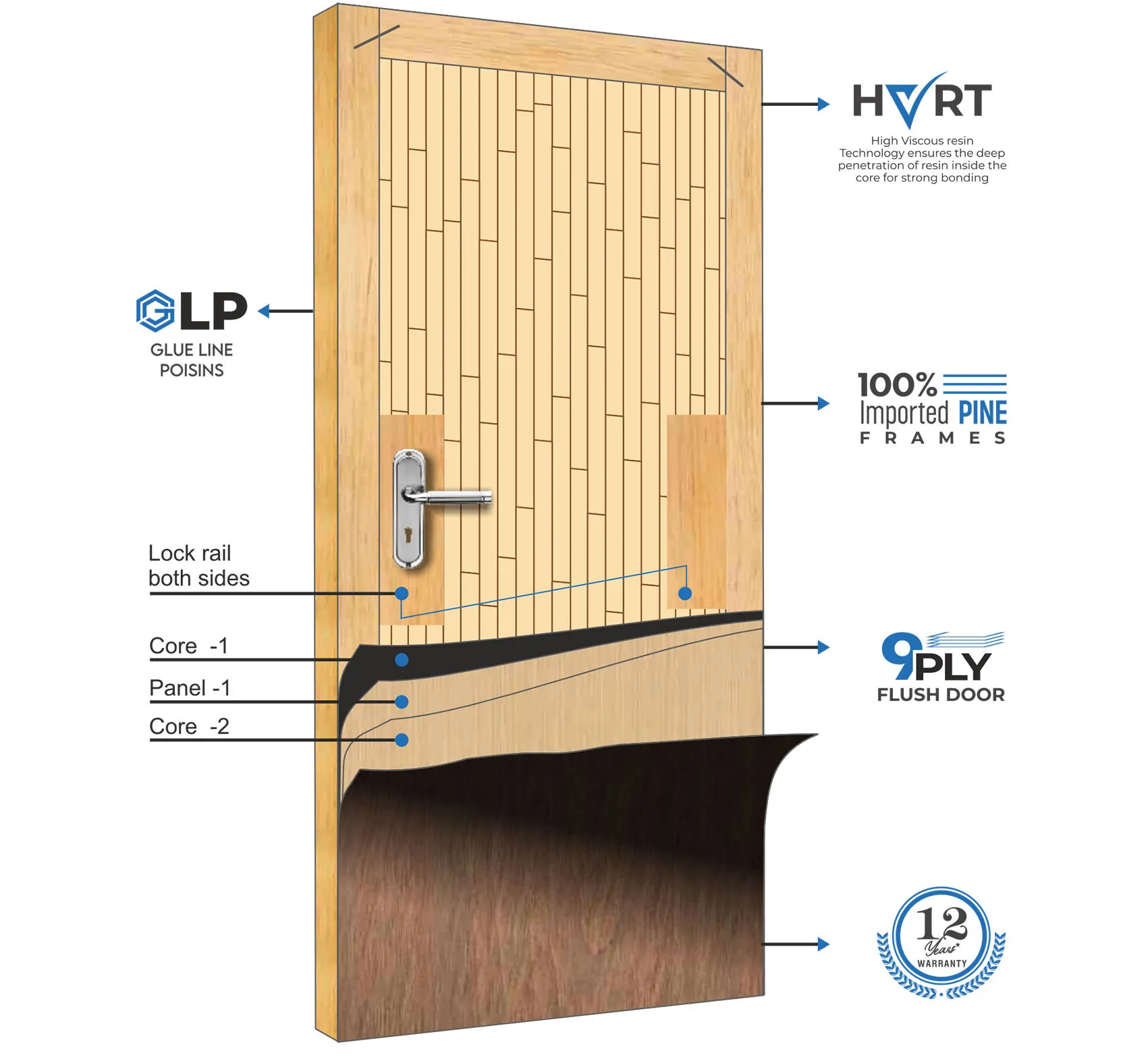 The high-quality doors are crafted from seasoned wood, high-density core materials, and strong bonding methods. Advance Plywood flush doors are built with high-quality materials that provide durability, a smooth finish, and resistance to warping and moisture.